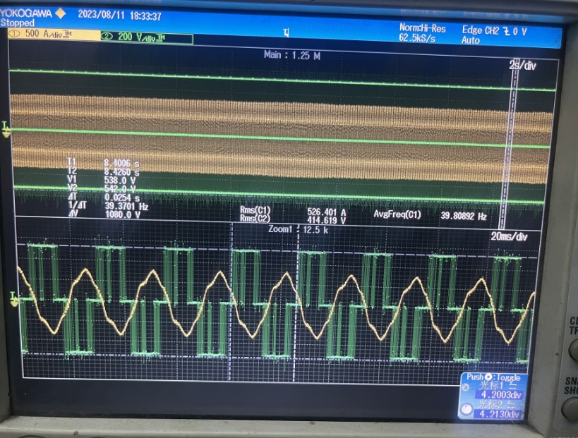 The current and voltage waveforms when the frequency inverter runs at 39.3HZ (157rpm)