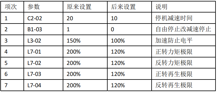 e.變頻器參數(shù)設(shè)置,停止方式由”自由運行”改為”減速停止”,減速時間 10 秒。