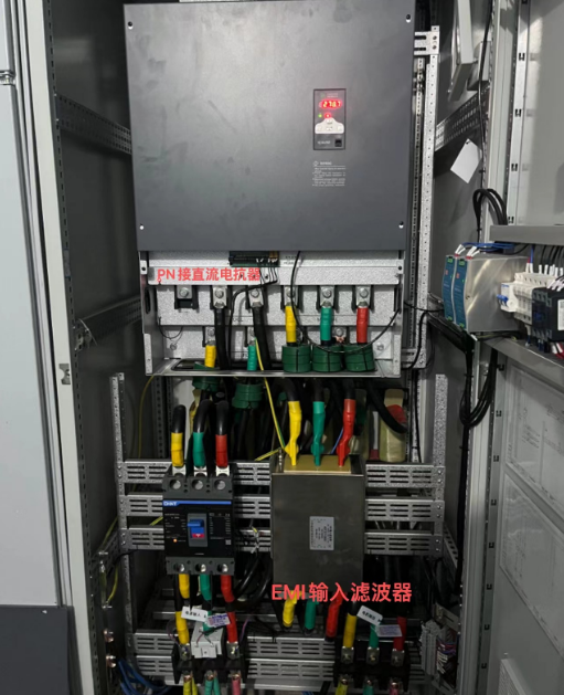 電機(jī)額定電流為290A,電機(jī)轉(zhuǎn)速1485轉(zhuǎn),額定功率160kw配電房和皮帶機(jī)電機(jī)之間的線(xiàn)纜超過(guò)150m。根據(jù)電機(jī)的型號(hào),我司選擇了額定電流370A的200KW變頻器。為了抑制電網(wǎng)中的高次諧波,防止變頻器被干擾,我司在變頻器輸入端加裝EMI輸入濾波器,不僅能起到補(bǔ)償作用,還可以提高整套設(shè)備的功率因數(shù)(節(jié)能)為了減少輸出電纜上和電機(jī)中的脈沖電流,延長(zhǎng)電機(jī)壽命,在變頻器與電機(jī)之間使用更長(zhǎng)的電纜連線(xiàn),所以我司選擇在變頻器母線(xiàn)加裝直流電抗器(降低母線(xiàn)紋波系數(shù),減少電流脈動(dòng)值),變頻器和電機(jī)之間加裝輸出電抗器,這兩者均可提升整套系統(tǒng)的功率因數(shù)(節(jié)能)。