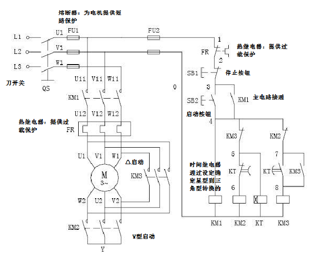 星-△啟動(dòng)電路如下圖,雖然比直接啟動(dòng)電機(jī)降低了啟動(dòng)電流,減少了對(duì)電網(wǎng)的沖擊,但是無(wú)法實(shí)現(xiàn)對(duì)電機(jī)的調(diào)速,讓電機(jī)始終在工頻運(yùn)行( 電機(jī)輸入電壓始終和電網(wǎng)電壓保持一致,電機(jī)的輸入電壓與無(wú)功電流成正比,輸入電壓越高,無(wú)功電流越大 )由此造成了不小的能源浪費(fèi)。