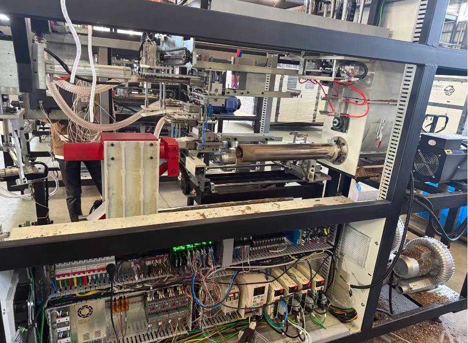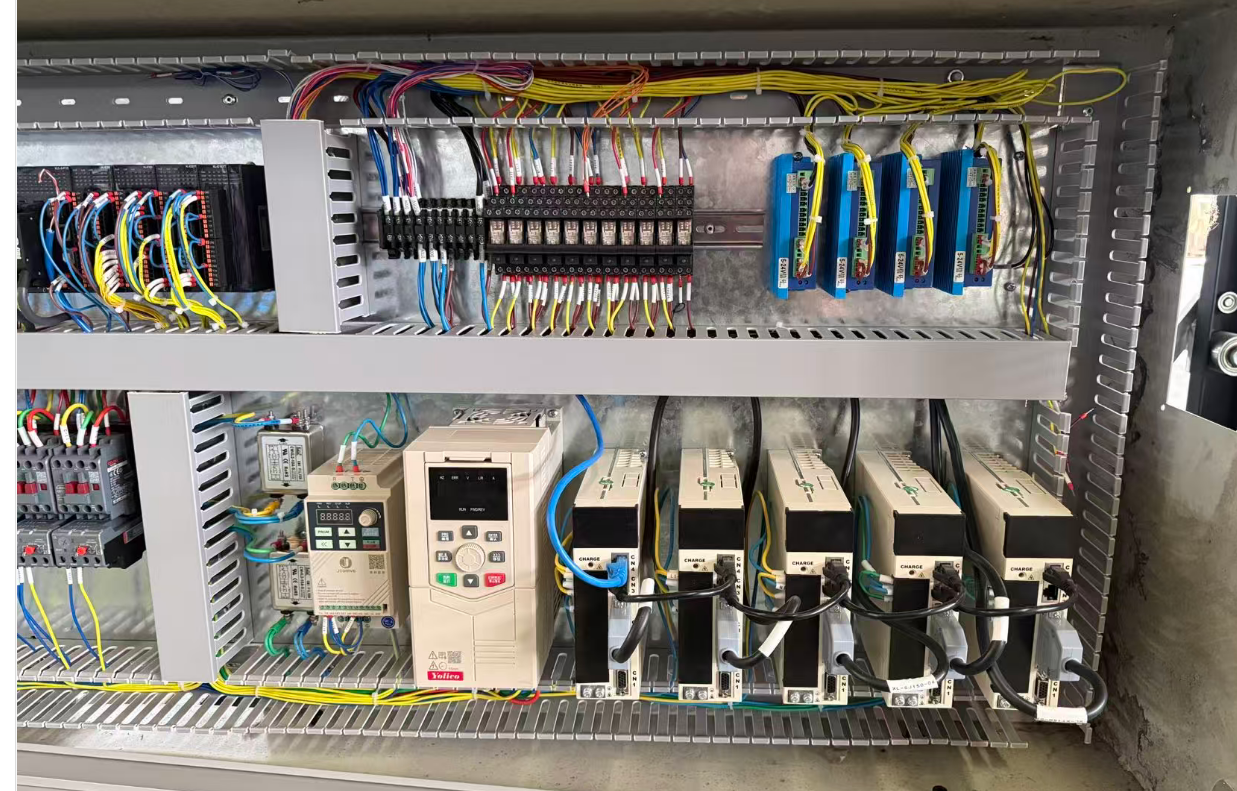 定量裝填是機(jī)器的核心功能。圖片中部的橫向圓柱形部件就是裝填機(jī)構(gòu)。其內(nèi)部有一個(gè)螺旋輸送器(絞龍),通過變頻器(YD280T4-11G/15PB)對(duì)電機(jī)的精確控制,螺旋輸送器旋轉(zhuǎn),將物料從料倉底部推送至出料口,通過控制螺旋輸送器的旋轉(zhuǎn)圈數(shù)或時(shí)間,可以精確控制每袋的裝填量,確保每袋重量一致。